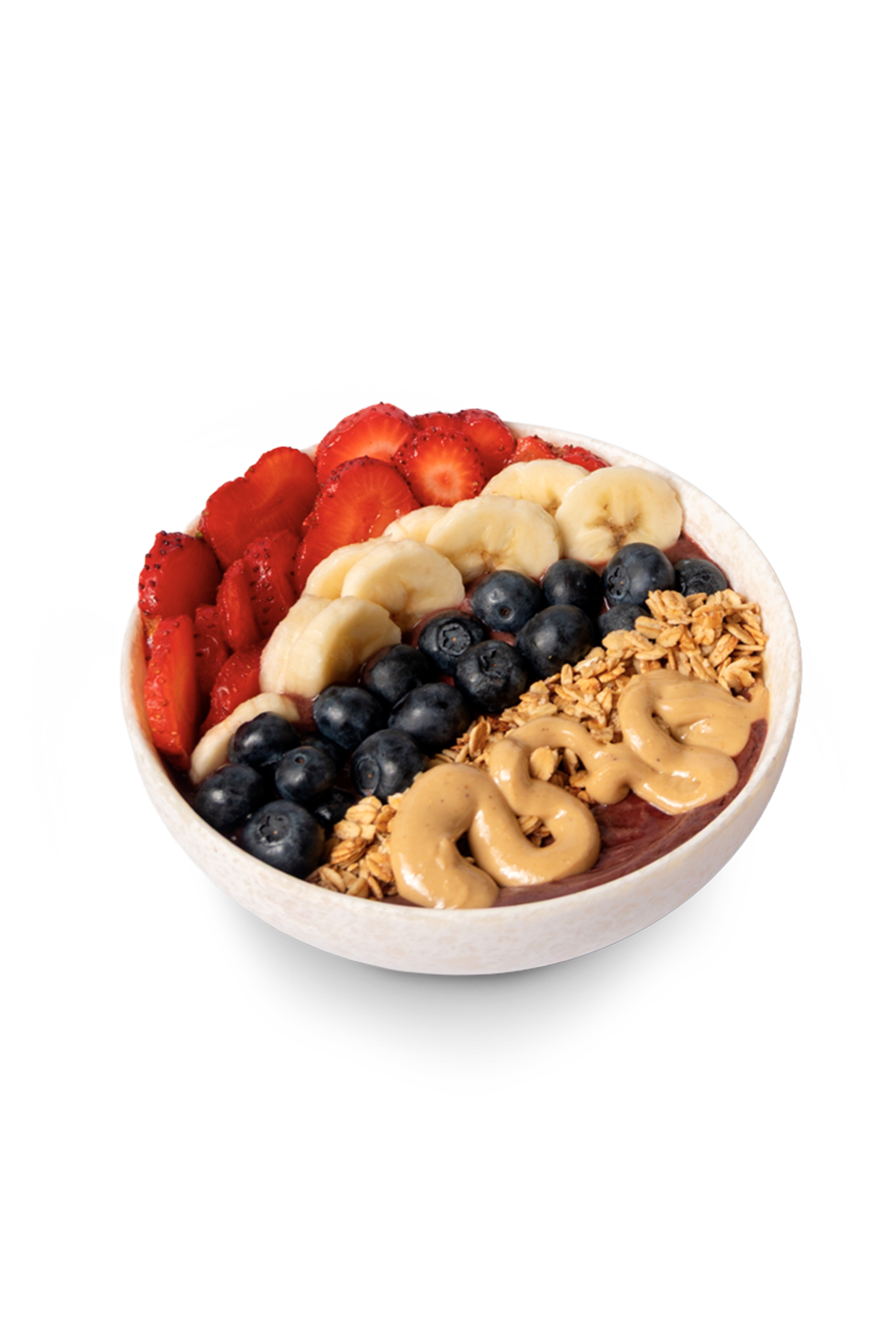 Nuestro açaí bowl más popular: fresas, plátano, arándanos, granola y crema de cacahuete 100% ecológica. Con nuestra base de pulpa de açaí endulzada con arándanos y guaraná.